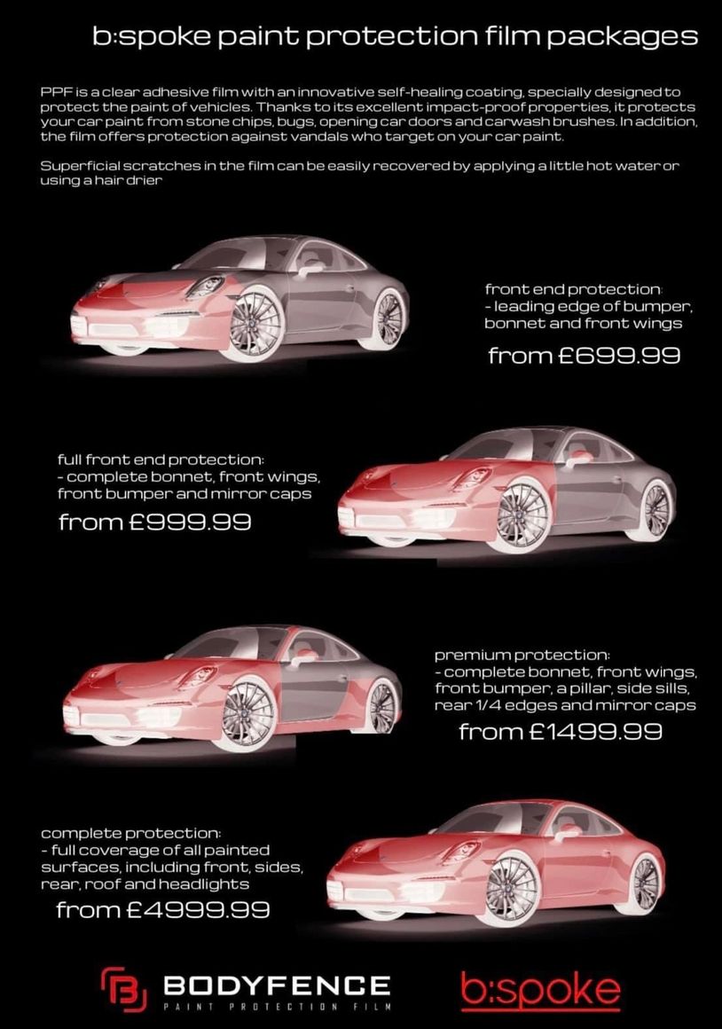 We can offer bespoke packages, from just the high impact zones, to full car coverage. Please contact us for more information.